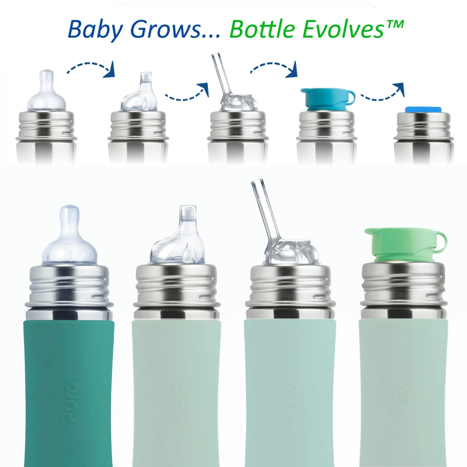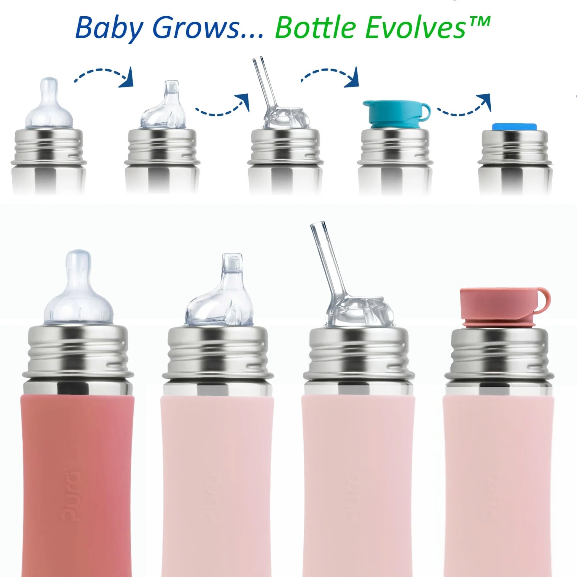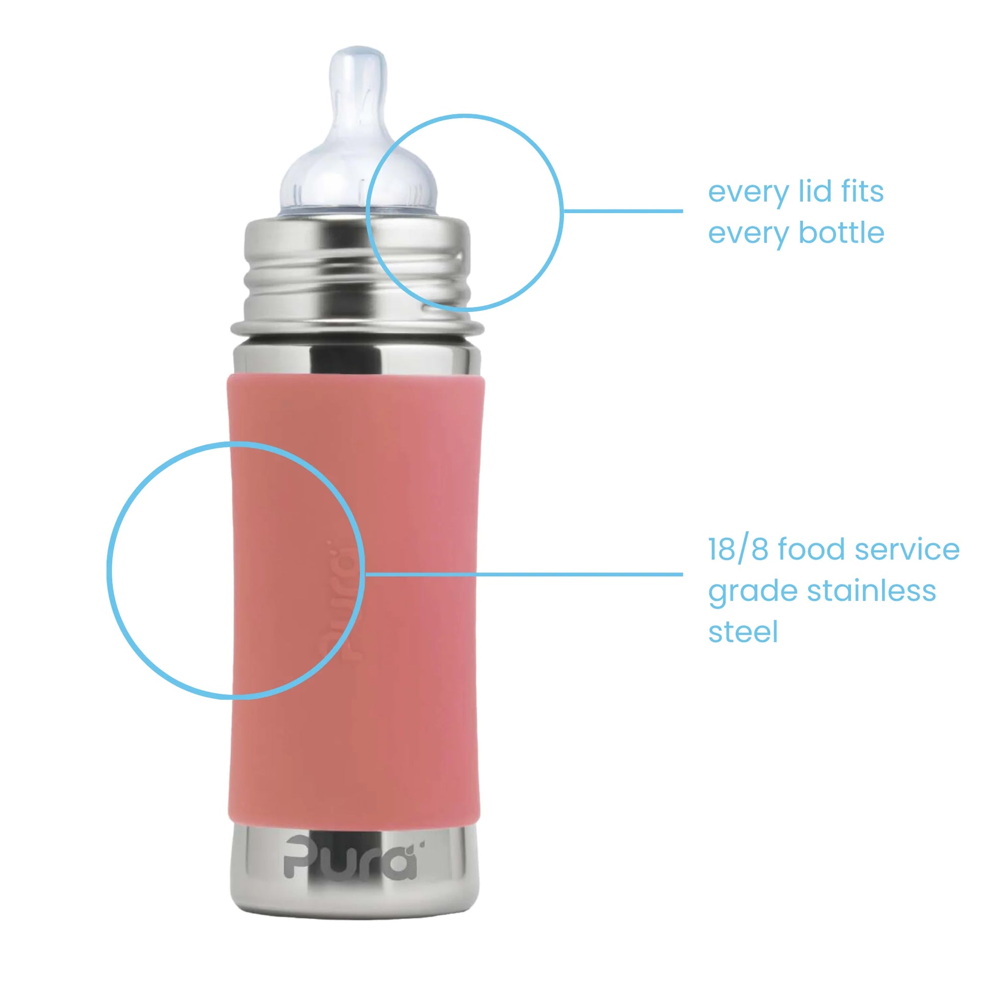 En trygg, bærekraftig og fleksibel flaske som vokser med barnet. Pura-flaskene er laget i 18/8 rustfritt stål og 100 % medisinsk silikon – helt uten plast og skadelige kjemikalier. Dette gir en ren og trygg drikkeopplevelse, samtidig som du velger et produkt som varer i mange år, siden du bare bytter ut korkene/toppene etter hvert som behovene til barnet endrer seg.